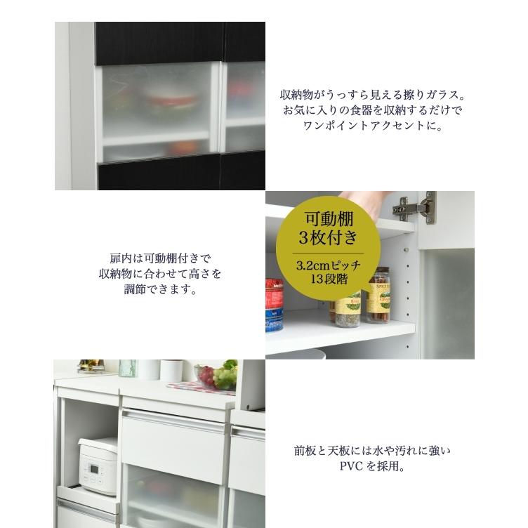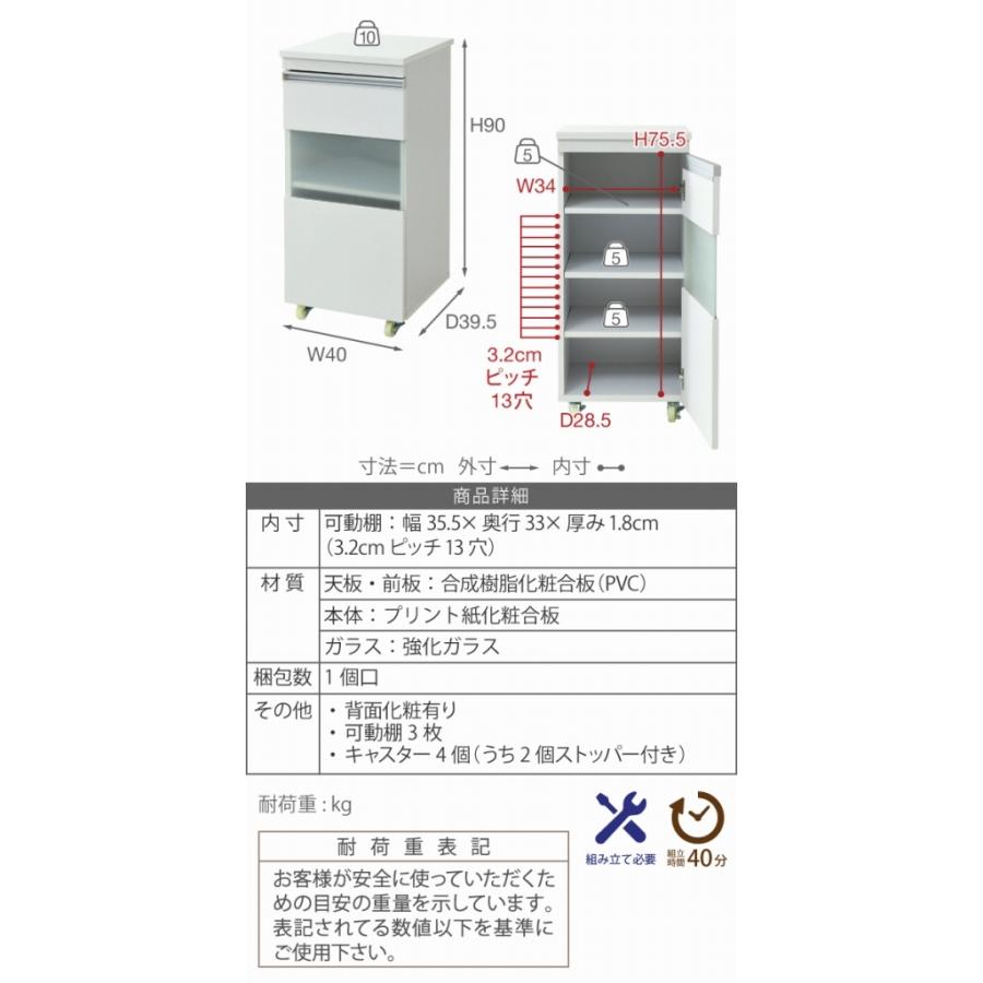 ■商品説明 収納物に合わせて高さ調節ができる可動棚付きの食器棚。天板にもちょっと物を置いたりディスプレイしたりと、ちょうど良い高さです。キッチンの隙間に設置すれば、それまでのデッドスペースを有効活用できます。■本体サイズ [外寸]幅40×奥行39.5×高さ90cm■組立時間(目安)(大人2人) お客様組立(40分)■備考・背面化粧有り・可動棚:3枚・キャスター4個(うち2個ストッパー付き)■材質[天板・前板]合成樹脂化粧合板(PVC)[本体]プリント紙化粧合板[ガラス]強化ガラス■収納量・耐荷重[天板]約10kg以下[可動棚]各約5kg以下