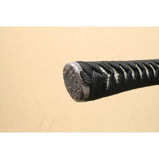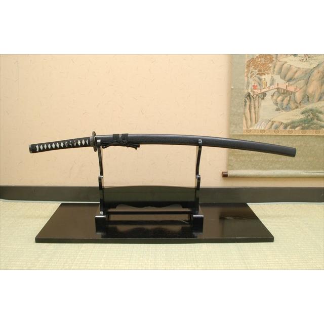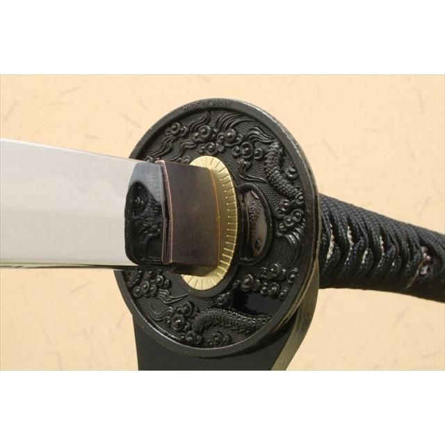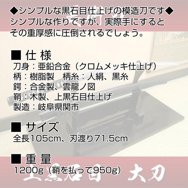 しのびや特製刀剣証明書・クリーニングクロス付き!シンプルな黒石目仕上げの模造刀です。シンプルな作りですが、実際手にするとその重厚感に圧倒されるでしょう。刀身:亜鉛合金(クロムメッキ仕上げ)柄:樹脂製 柄糸:人絹、黒糸鍔:合金製、雲龍ノ図鞘:上黒石目仕上製造:岐阜県関市種 類 日本刀-模造刀・模擬刀 サイズ 全長105cm・刃渡り71.5cm 重 量 1200g(鞘を払って950g) ↓取り扱い上のご注意↓・刃文が装飾として施されておりますが、実際には切れません。 ・刃は付いてないですが合金製ですので人に向けての使用はおやめ下さい。・分解・調整は出来ない拵えになっております。・サイズ・重量に関しましては、天然木、手作業のため多少の誤差が生じますがご了承ください。・写真の刀掛け台は付属いたしておりません。・居合刀対応:×★美術刀剣★