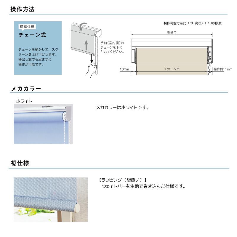 サンゲツ ロールスクリーン RBコレクション ■セレクトカラー40R RS101〜RS140 小窓TD型幅広いサイズに対応、お部屋を広くスッキリと見せます。特に小窓や腰窓におすすめ、間仕切りや目隠しにも。メカタイプ:小窓TD型操作方法:チェーン式メカカラー:ホワイト裾仕様:ラッピング(袋縫い)機能:防炎・ウォッシャブル組成:ポリエステル100%製作可能寸法比率(巾:高さ)1:8巾5mm単位、高さ10mm単位でオーダー製作いたします。高窓等、製品高さよりも高い位置に取付ける場合は、チェーンの長さを10mm単位でご指定ください。画像の色とは多少異なる場合があります。