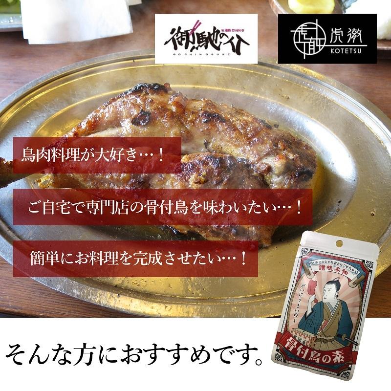 一鶴 といえば知る人ぞ知る香川県の骨付鳥の名店ですが、讃岐の料理人が開発した調味料『骨付鳥の素』は 香川県産にんにくを使用し、本場香川のスパイシーな味の再現にこだわりました。飲食店の料理を支えている料理人たちが何度も試行錯誤して作り上げた逸品です。1袋30gで鳥もも肉(骨付き300g)3〜4本分が作れます。非常にスパイシーなこの料理は、 ビール、チューハイとの相性が抜群!骨付鳥の油を炭酸で「グッ」と一緒に飲み込む爽快感はまさに絶品です!香川県で昔から愛されてきた骨付鳥コロナ禍でお家時間が増えた今、全国のご自宅でご当地グルメを味わっていただきたい!※骨付鳥とは、コショウ、ガーリックで味付けした骨付きの鶏もも肉を焼いた香川県丸亀市発祥の料理です。香川の有名店では 寄鳥味鳥 などでも骨付鶏を味わえます。