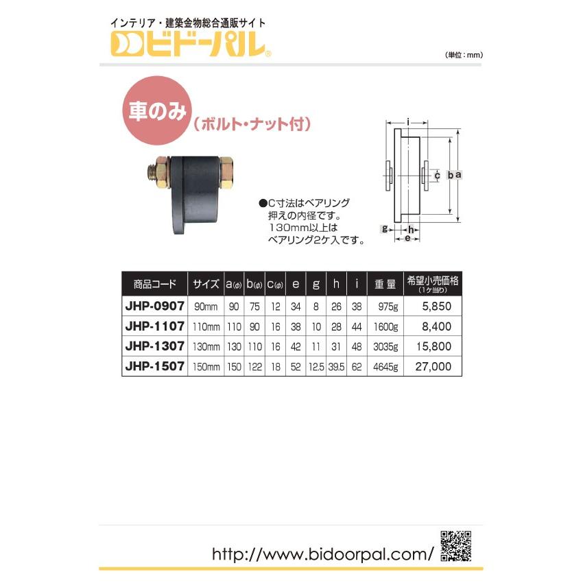 【※ご注文の際には必ず「全ての画像」「説明テキスト」「商品名(特にサイズ)」の確認をお願い致します。】戸車メーカーとして高い実績を誇るヨコヅナの重量車です(車のみ)。ボルト・ナット付き。【用途】門扉・工場・出入口用扉・各種倉庫など。【製品特長】ベアリングを使用しているので、耐久力に優れています。【同シリーズ展開一覧(メーカー品番)】JHM-0907、JHM-1107、JHM-1307、JHM-1507※枠付きタイプの参考耐荷重は車のみの場合には該当しません。※枠付きタイプの販売も行っています(関連商品参照)。"}