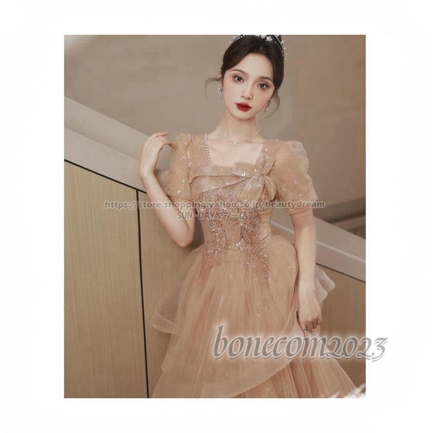 スクエアネック エンパイア 可愛いビーズ オーガンジー 半袖 可愛い蝶結び パーティードレス 細身 ワンピース レディースドレス 花嫁ロングドレスHA
