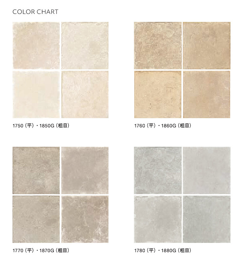 南イタリアのサレント半島オストゥーニは、欧州有数のリゾート地。その白い街並みの石畳に着想を得た明るく上品なエイジングタイルです。タイル四辺の縁は、擦れて欠けた様子を表現したヴィンテージ・エッジに仕上げています。 ◆品番: CDS-L1750 CDS-L1760 CDS-L1770 CDS-L1780"} 〇●〇ご確認ください〇●〇