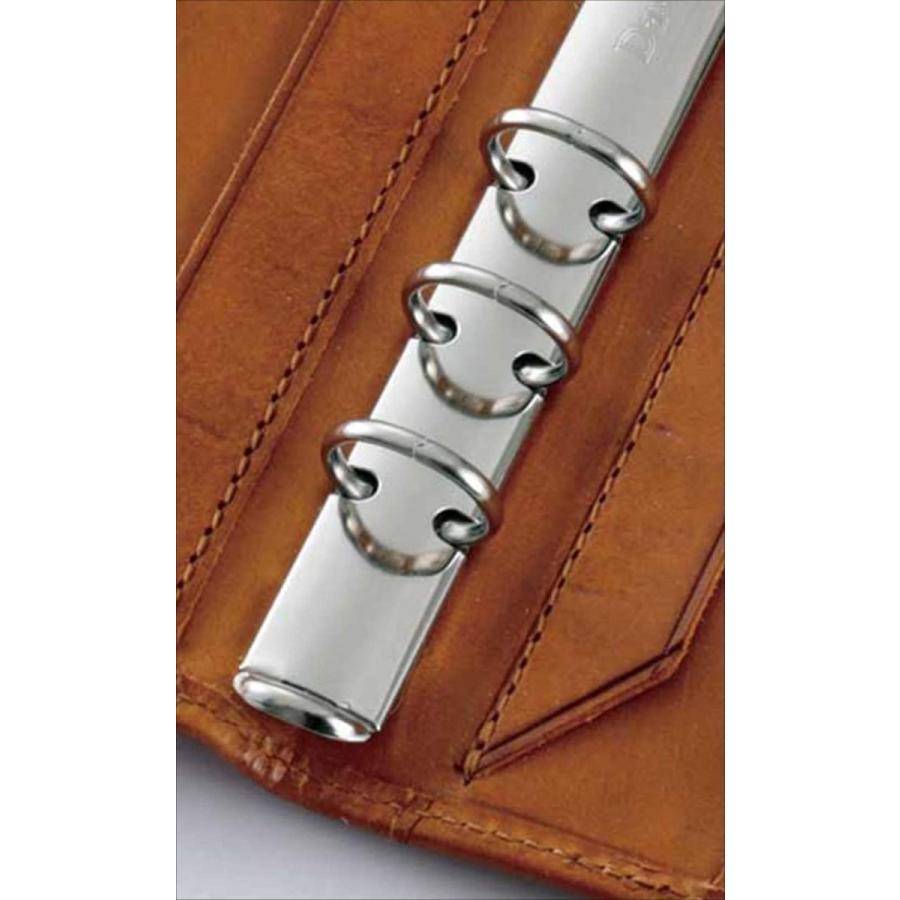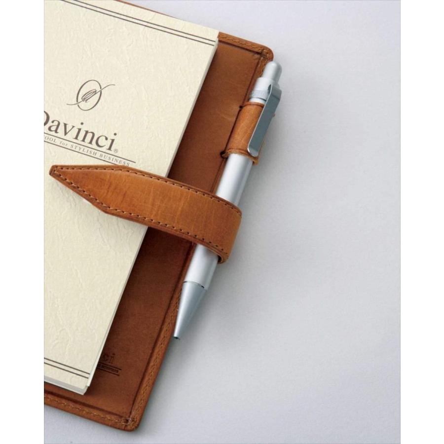 リングの跡が表にひびかない当て革と、約14mm径のペンから細いペンまでお手持ちのペンに合わせて調整できる可動式ペンホルダー付です。