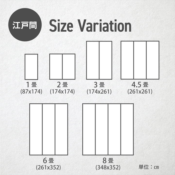 | 江戸間1畳 江戸間2畳 江戸間3畳 江戸間4.5畳 江戸間6畳 江戸間8畳 |