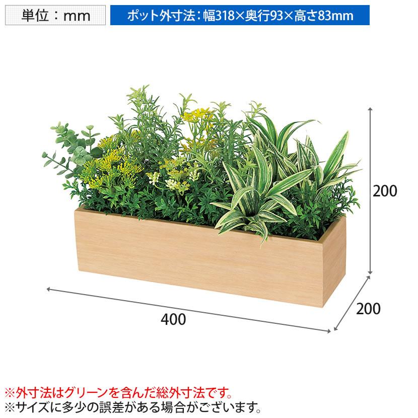 | サイズ | 外寸 / 幅400×奥行200×高さ200mm ポット外寸 / 幅318×奥行93×高さ83mm ※外寸法はグリーンを含んだ総外寸法です。サイズに多少の誤差がある場合がございます。 ※写真はイメージです。葉の種類は異なる可能性があります。 |