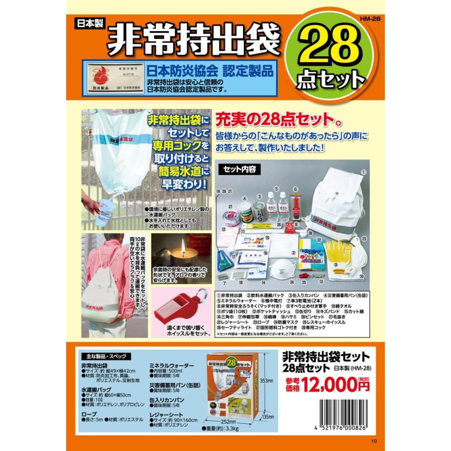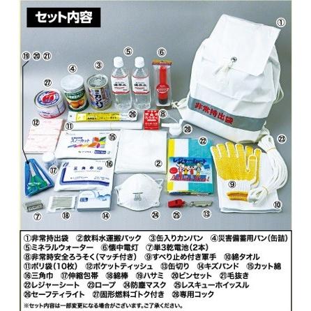 【非常持出袋】サイズ:約 縦49x横42cm材質:防炎加工布、真鍮、ポリエステル、反射生地【水運搬バッグ】サイズ:約 縦60x横50cm容量:10リットル材質:ポリエチレン、ポリプロピレン【セット内容】非常用持出袋・飲料水運搬パック・缶入りカンパン・防災備蓄用パン(缶詰)・ミネラルウォーター・懐中電灯・単三乾電池(2本)・非常時安全ろうそく(マッチ付き)・すべり止め付き軍手・綿タオル・ポリ袋(10枚)・ポケットティッシュ・缶切り・キズバンド・カット綿・三角巾・伸縮包帯・綿棒・ハサミ・ピンセット・毛抜き・レジャーシート・ロープ・防塵マスク・レスキューホイッスル・セーフティーライト・固形燃料ゴトク付き・専用コック*セット内容は一部変更になる場合がございます。ご了承ください。【生産国】 日本製"}