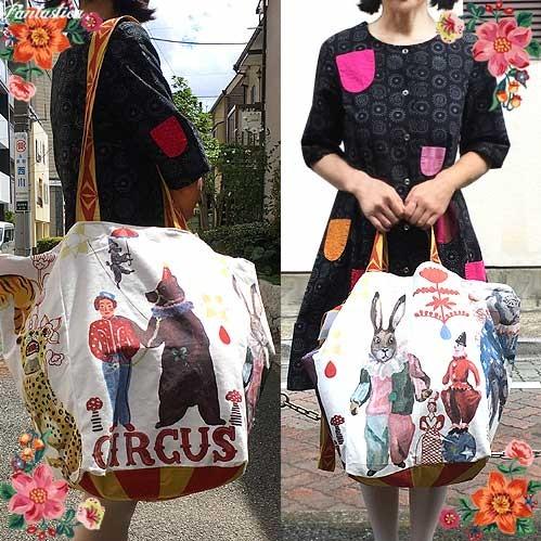 ナタリー・レテの描くポップ&シュールな世界がラージサイズのマーケットバッグになりました!こちらはナタリーのモンドな世界観をぞんぶんに堪能できるサーカス・モチーフの華やかな一品。調教師の肩に手をかけ微笑するクマ、綱渡り中のプードル、煌びやかな衣装に身を包んだ耳長ウサギにピエロ、大迫力の玉乗りゾウに、可愛らしい表情で声を上げるトラや豹・・・。見ているだけでワクワクするような、ナタリー・サーカス・ショウの始まり始まり!幅広のマチは肩にかけるとぐっとボリュームアップ! 大振りながらシルエットの美しさもこのバッグの特徴のひとつです。サイドには別の持ち手も着いているので、こちらを手持ちすればたちまち程よい大きさのシルエットに早変わり♪ 様々な持ち方ができる上に、バッグ四面に描かれた絵がそれぞれ異なるので、微妙なコーディネイトを楽しめます!バッグの裏側は一面ナタリー・デザインのテキスタイル。リバーシブルすればたちまち東欧風バッグに大変身!普段着のお買い物でのご使用はもちろん、ピクニックに持って行っても楽しそう♪ ちょっとした旅行のお供にもぴったり!お部屋のインテリアとして壁にかけてもかわいいですね。