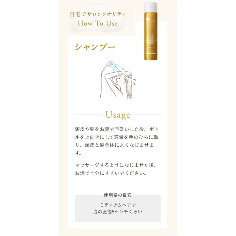 頭皮や髪をお湯で予洗いした後、ボトルを上向きにして適量を手のひらに取り、頭皮と髪全体によくなじませます。