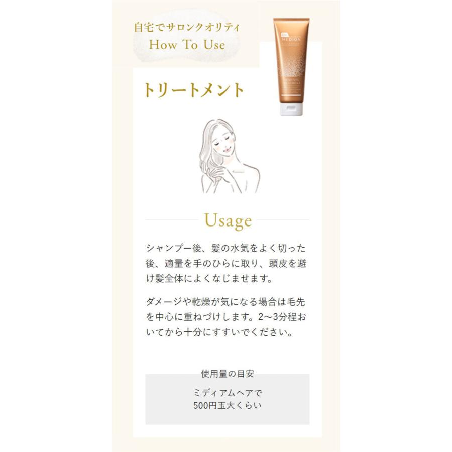 シャンプー後、髪の水気をよく切った後、適量を手のひらに取り、頭皮を避け髪全体によくなじませます。