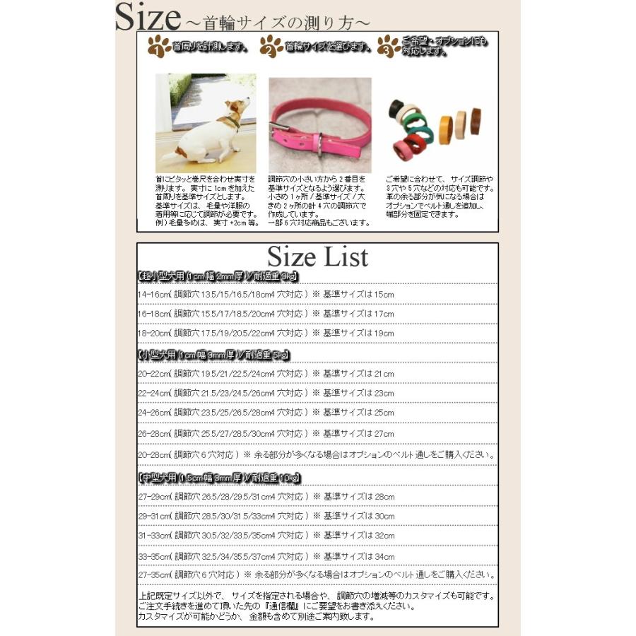 ・革紐を丁寧に手縫いでかがり、チャンピオンベルト風に仕上げた首輪とリードのセット・(リードのみ)名前と番号の無料刻印(名前入り)サービス付き・オーダーメード感覚で、ご希望サイズのカスタマイズ(※注)にも対応・耐久性を考慮し、丈夫な背面部分の皮革を使用・金具はシルバー色を使用※首輪サイズは毛質・毛量を考慮し、ヌード実寸より1〜2cm程度の余裕を持たせた首周りが、調節穴4穴タイプの2番目になる程度がお勧めです※ナチュラルは、次第に茶褐色に変化します※ご注文を頂いてから染色・作成となり、3~7営業日程度お時間を頂きます※気温や湿度等により、若干色目が異なる場合があります※金具は変更になる場合があります(※注1)■色ピンク/オレンジ/ブルー/グリーン/ナチュラル/ホワイト/レッド/ブラウン/ブラック■サイズ(首輪)1.5〜5.5cm幅3mm厚/約77g/耐荷重約10kg/首周り:27〜34cm(リード)長さ110cm/1.5cm幅3mm厚/約90g/耐荷重約10kg※カフェタイプの場合/約16g加算■素材牛ヌメ革お揃いのシリーズは、もっと商品情報を見るをクリック!■カラフルに手染めした牛本革に革紐を丁寧に手縫いでかがり、