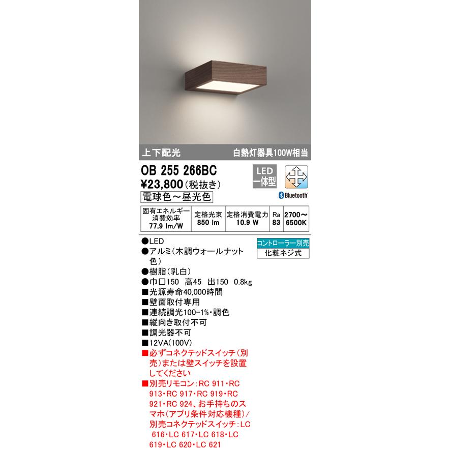 住宅用照明器具 オーデリック ブラケット OB255266BC 検索用カテゴリ6 【LED照明】 【調色】 【調光可】●導光方式が生み出す均一な面発光、空間に溶け込む薄型フォルム。上下配光型でハイパワーな光を提供する薄型ブラケットライト。