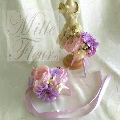 ピンクパープルガーベラ 花冠 リストレット ブートニアセット