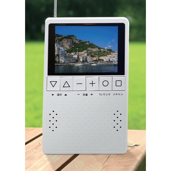 3.2型液晶ワンセグTV搭載ラジオ緊急時などの情報収集に!ワンセグ付きラジオ。●色/ホワイト●災害発生時の生命線!適切な情報を迅速に集める防災グッズです。普段から自分専用機として操作に慣れておくと、いざという時に慌てず使えます。●便利な2電源対応:外出時は単3乾電池で、ご自宅ではUSB給電で●ワンセグTV・AM/FMラジオ・ワイドFMラジオ・スピーカー搭載・イヤホン付属●カラー液晶3.2型●高感度アンテナ&チューナー搭載!●コインを挿して自立も可能!●手のひらサイズのコンパクト設計※各種放送は一部地域や環境により電波が入らない場合があります。※USBケーブルは付属しておりません。別売のUSBケーブルをお買い求めください。[仕様]●電源:単3形乾電池3本使用(別売)・DC5V/0.5A●消費電力:1.5W●受信周波数:[ワンセグ]UHF470~770MHz、[FM]76.0~108MHz、[AM]522~1701KHz●画面:3.2インチ液晶(解像度320×240)●スピーカー:8Ω/0.8W×2●1年間保証書付きサイズ・容量 ●サイズ:(約)幅8.8×奥行1.9×高さ14.2cm●重さ:(約)132g(電池を除く)●素材/ABS樹脂、他●中国製"}