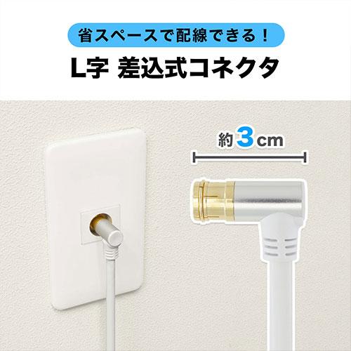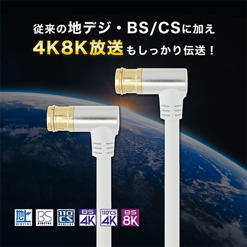 | アルミヘッドを採用した高級感のあるデザイン ■4K/8K衛星放送対応 従来の地デジ、BS、CS放送に加えて、最新の4K/8K放送にも対応しています。 ■配線しやすいL字差込式 L字差込式コネクタは、狭い隙間にあるアンテナコンセントや機器への接続に最適です。 ■優れたデザイン性 洗練されたアルミヘッドで飽きのこないデザイン。 ■豊富なバリエーションでシチュエーションに沿ったケーブルをお選びいただけます。 ■幅広い周波数帯域で安定した伝送が可能なS-4C-FB規格を採用 ■信号が劣化しにくい両端子金メッキ仕様 |