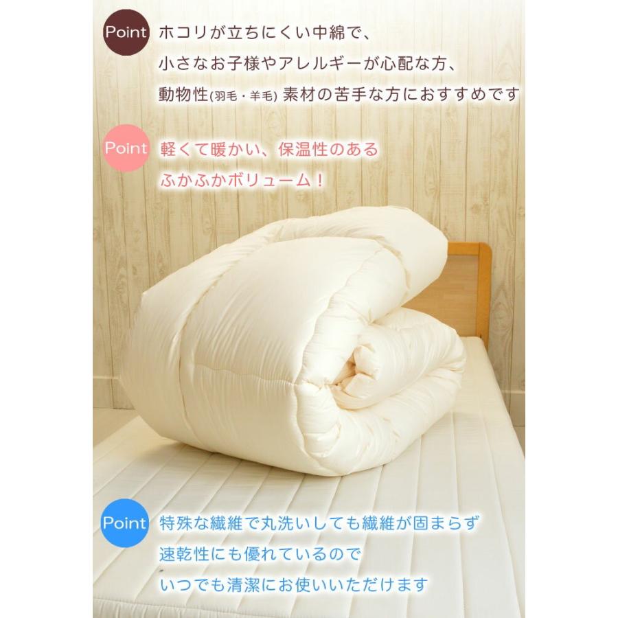 洗える素材、ダクロン(R) フレッシュが使用されたこちらの掛け布団は素早く水に沈み込むよう特殊コーティングされた繊維でできているので、ご家庭で簡単に丸洗いしていただくことが可能です。速乾性にも優れ、羽毛の約3倍の速さで乾くのも毎日使う寝具には嬉しいポイント!また、ホコリが立ちにくい中綿のため、小さなお子様やアレルギーのある方、動物性(羽毛・羊毛)の臭いや素材が苦手な方に特にオススメの寝具です。繊維の中にある空気孔によってお布団は軽く暖かです!日本の工場で職人が丁寧に仕上げた掛布団を是非使ってみてください。 ■サイズ: ダブルサイズ 約190x210cm■生地:ポリエステル65% / 綿35% ■中身:ポリエステル100% / 2.2kg (ダクロン(R)フレッシュ) ■仕様:丸洗いOK / 8か所ループ付き■生産地:日本製※画面上の色はブラウザや設定により、実物とは異なる場合があります。ご了承の上ご注文下さい。※こちらの商品は送料無料でお届けいたします。