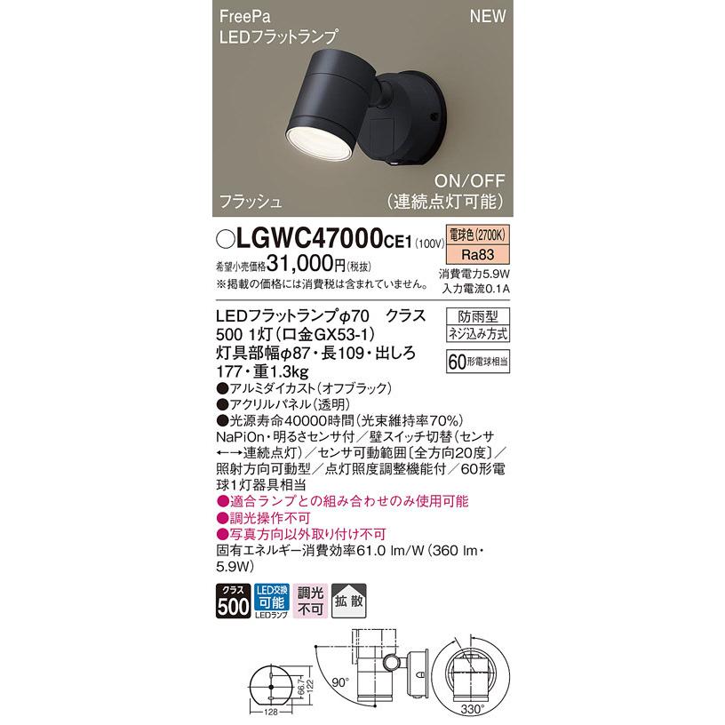 【法人様限定】パナソニック LGWC47000 CE1 LEDスポットライト 屋外用 壁直付型 拡散 防雨 FreePa 電球色