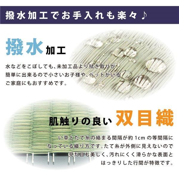 畳の素材である「い草」を気軽に味わうことができる敷き詰めタイプの上敷きです。撥水加工付きなので、水などをこぼしても未加工品よりも拭き取りが簡単にできるので、小さなお子様がいるご家庭にもおすすめです。肌触りの良い双目織です。
