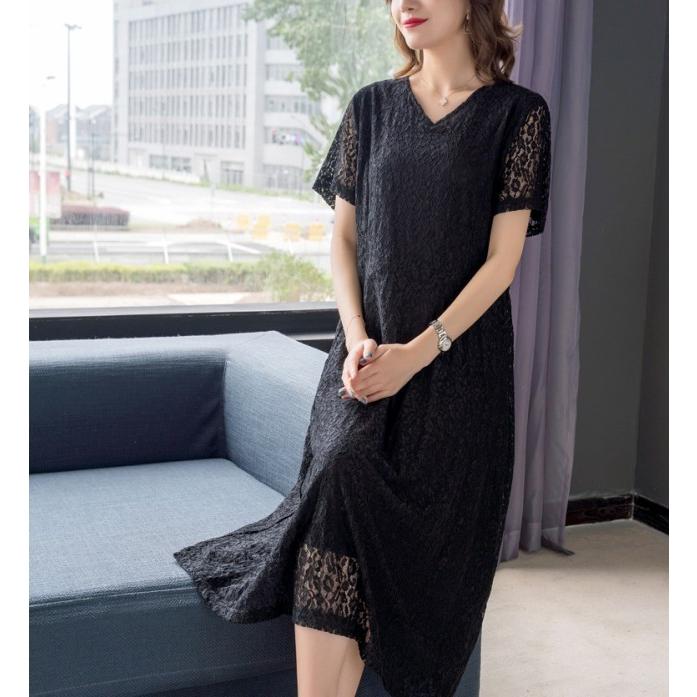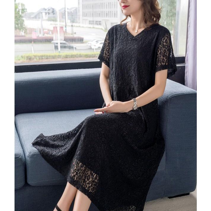 パーティードレス 結婚式 お呼ばれドレス ワンピース フォーマル 袖あり 大きいサイズ 3L 4L 5L 6L 7L 総レース 花柄 黒 ミモレ丈 ゆったり 体型カバー