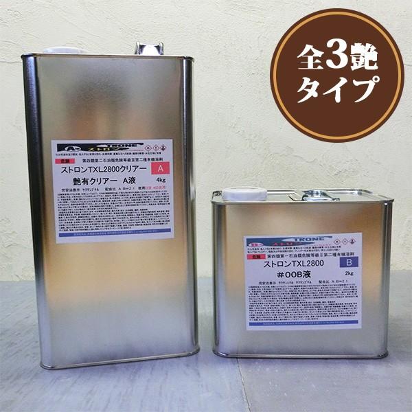 ストロンTXL2800クリアー 6kgセット(A液4kg・B液2kg)ニ液型のウレタンクリアーですので無色透明で強靭な塗膜を作ります。A液とB液を2:1の割合で混合し、ストロンTXLシンナーで希釈して塗装します。カシュー塗料の上にも塗装が出来ますので、表面のキズ防止の最終仕上げとしてお使い戴けます。
