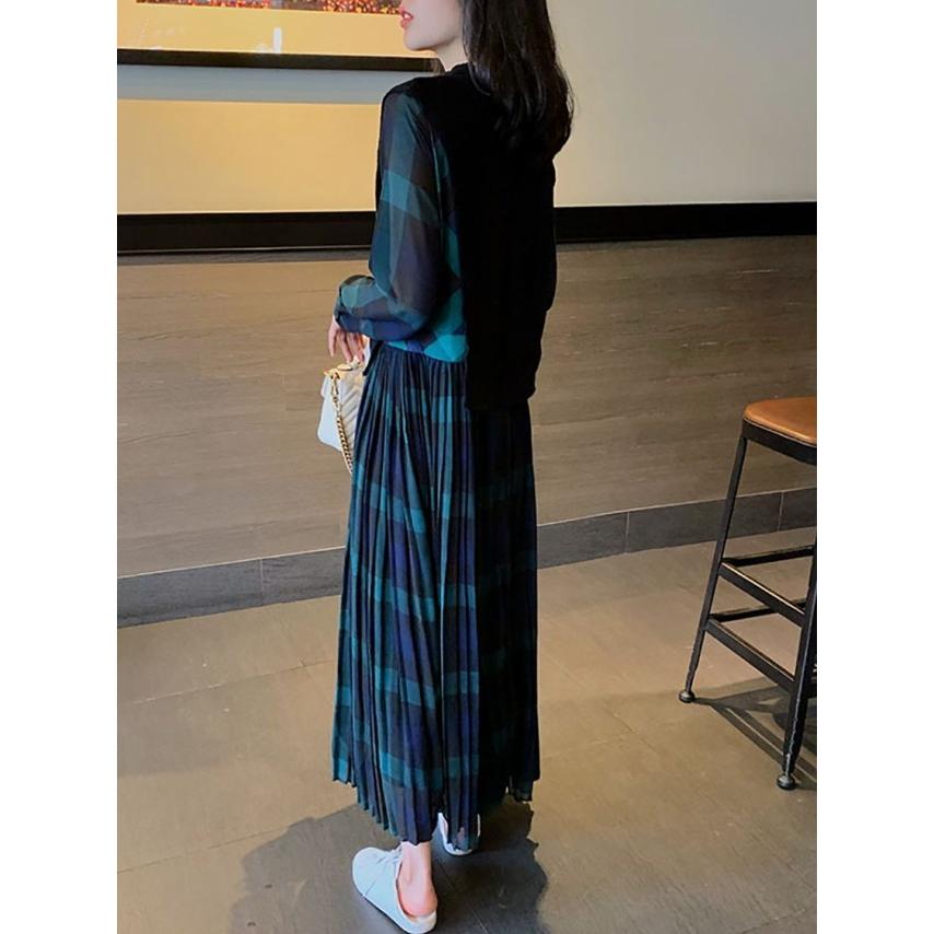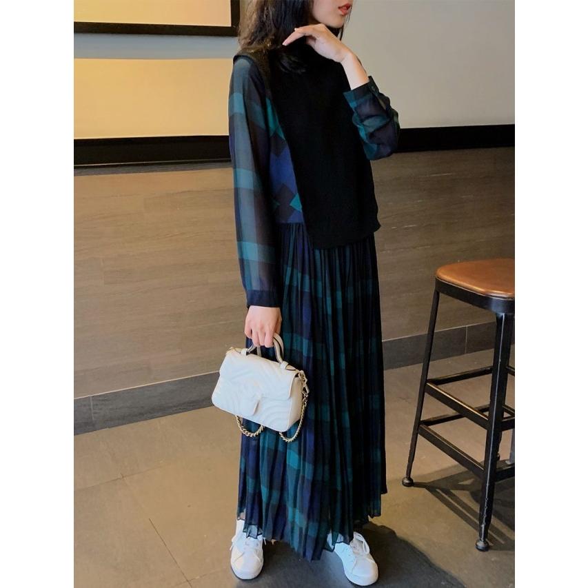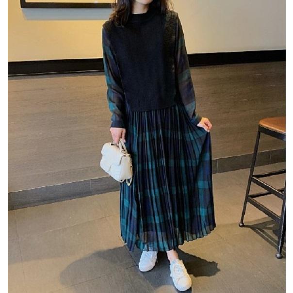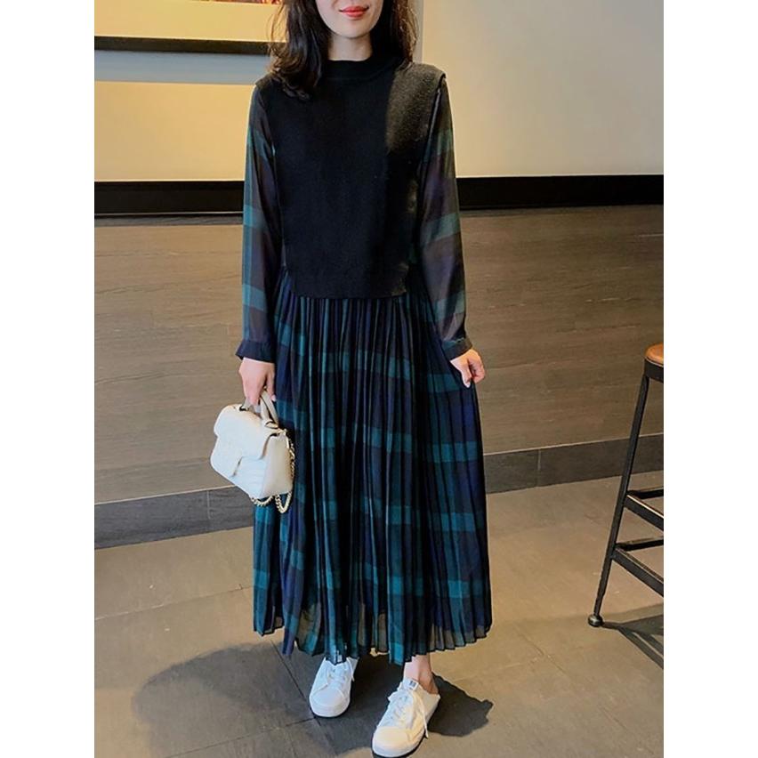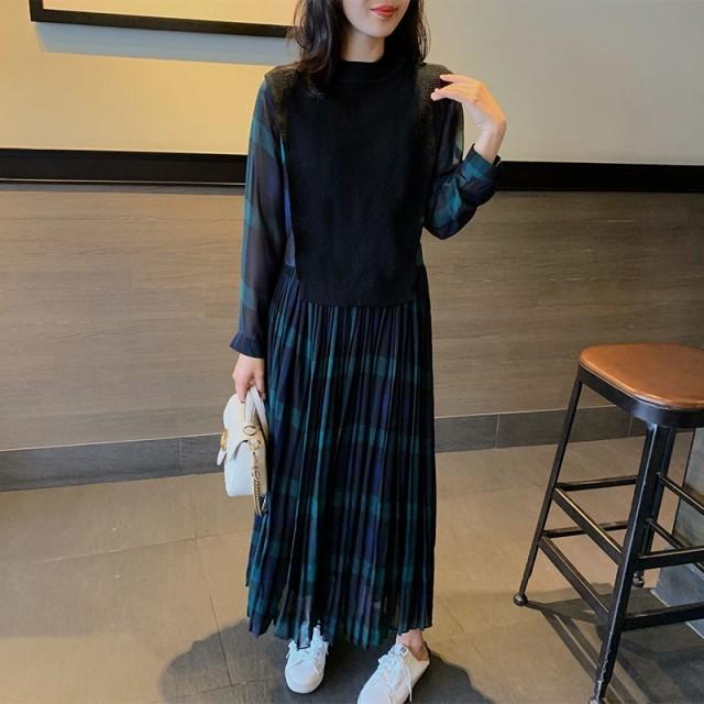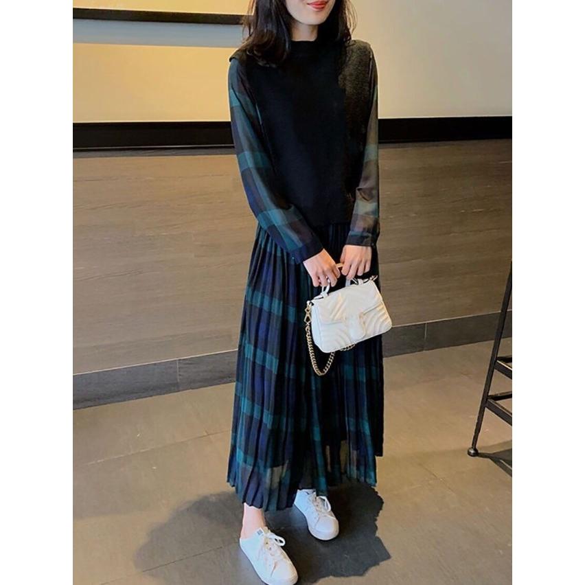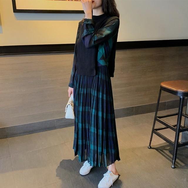 レイヤード風ワンピース 切り替え ワンピース レディース ロング 長袖 マキシワンピース チェックワンピース 大きいサイズ 3L 4L 5L カジュアル