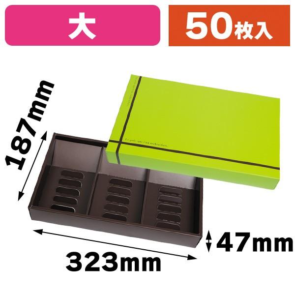 《仕様》───────────────── [サイズ]内寸:323×187×47mm 宅配便サイズ:60サイズ対応 [材 質]コートボール [重 量]193g [ 色 ]フタ:グリーン 身:茶 (表面加工:マット) [形 状]カブセ式(仕切付) [品 種]和洋菓子用ギフトパッケージ [入 数]50枚入 [単 価]1枚あたり@222.5円(税別) [型 番]20-462G─────────────────────【2023年2月27日より価格改定】"}