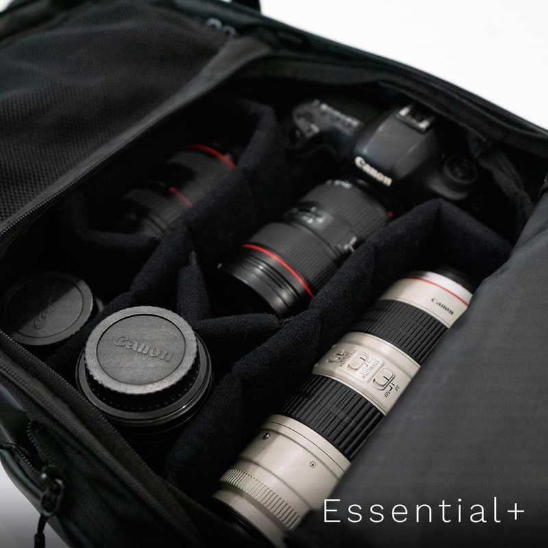 機材や荷物の量によって、さまざまなパターンに対応できるようなサイズ展開になりました。本体外側、内側のディバイダーともに素材はしっかりと厚く、また付属しているエラスティックストラップを取り付けることで、機材をよりきちんと保護しながら持ち運べます。