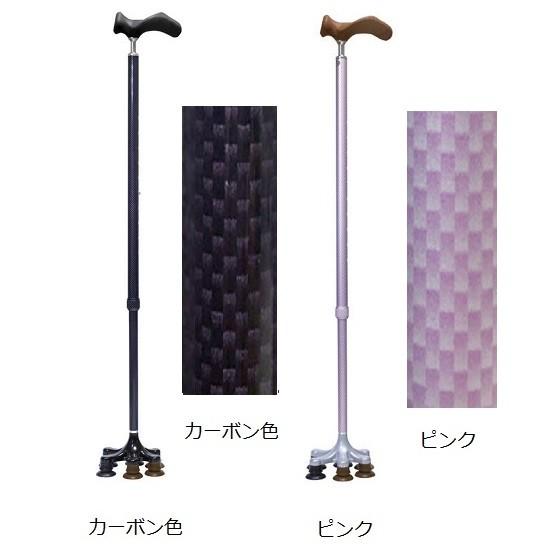 六つの杖先でしっかり安定、スムーズに歩けます。右手用/左手用に専用グリップを用意しました。サイズ:全長 / 65.0〜87.5cm(2.5cmピッチ) 接地面 / 11.8cmD 握り / 13.0cm材質:握り / プラスティック 支柱 / アルミニウム重量:490gカラー:カーボン色・ピンク専用杖先は別売でご用意しています。"}