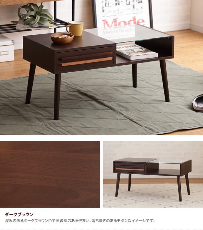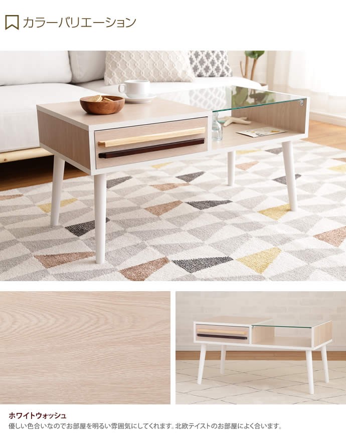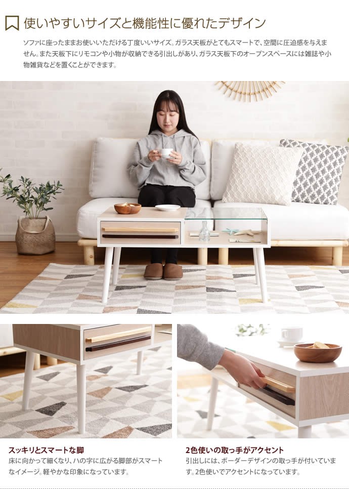 センターテーブル テーブル ローテーブル ガラステーブル 引出付き ガラス天板 幅80cm 収納 引き出し 棚 ラック 強化ガラス 北欧 リビングテーブル 木製