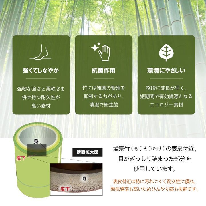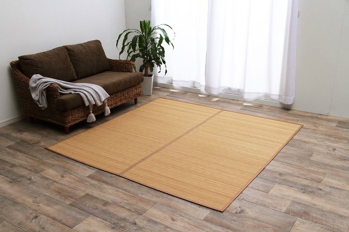 ■ 竹を使用した丈夫な天然素材のラグです。 ■ 竹は耐久性に優れている為、ペットがいるご家庭でも長持ちします。 ■ また、抗菌防臭・消臭効果もあるため、ペットの臭いも気になりません。 ■毛が絡まることもないので、お掃除も簡単です。 ■熱伝導率が高いため、ひんやり感はもちろん、ホットカーペットカバーとしても熱が伝わりやすく、オールシーズンご使用いただけるラグです。 ※ 掲載写真は表記サイズと異なる場合がございます。 ※ 画面上のカラーはご使用ブラウザやモニターの設定により、実物とは若干異なる場合がございます。あらかじめご了承の上、ご注文をお願いいたします。 | |