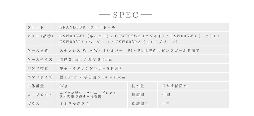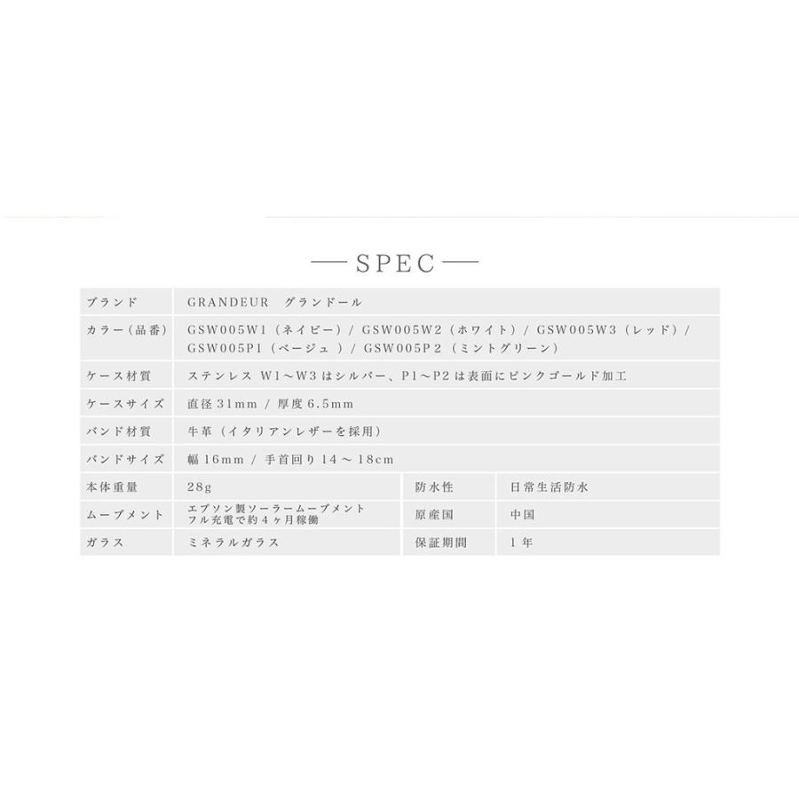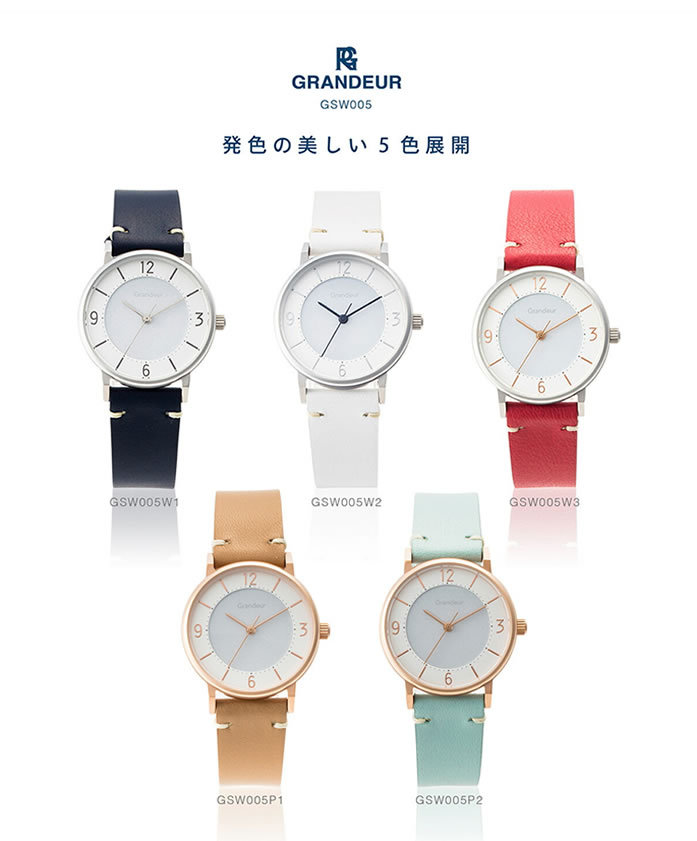 GRANDEUR グランドール 腕時計 レディース ソーラーウォッチ グランドールエレガンス Elagance GSW005 ラッピング無料 ホワイトデー プレゼント 肌に馴染むカラーはデイリー使いにおすすめ! 誰にでも好かれる優しく上品なペールピンク、気持ちを落ち着かせてくれるベージュ、 穏やかさや温かさのあるキャメルの3色からお選びいただけます。 □仕様 エプソン製ソーラームーブメント(フル充電で約4カ月稼働) 日常生活防水 □素材 ケース:ステンレス (W1〜W3はシルバー、P1〜P2は表面にピンクゴールド加工) バンド:牛革(イタリアンレザー使用) ミネラルガラス □サイズ(約) 直径31mm/厚6.5mm バンド幅:16mm 手首周り:14〜18cm 重量:28g □カラー GSW005W1 (ネイビー) GSW005W2 (ホワイト) GSW005W3 (レッド) GSW005P1(ベージュ) GSW005P1 (ミントグリーン) □付属品 ボックス 取扱説明書・保証書"}