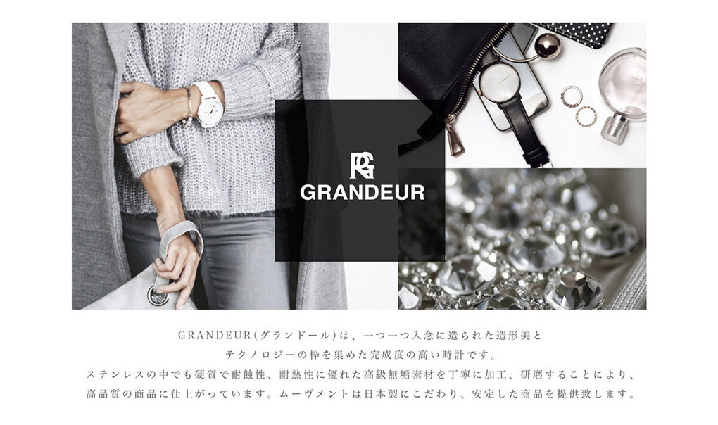 GRANDEUR グランドール 腕時計 レディース ソーラーウォッチ グランドールエレガンス Elagance GSW005 ラッピング無料 ホワイトデー プレゼント 肌に馴染むカラーはデイリー使いにおすすめ! 誰にでも好かれる優しく上品なペールピンク、気持ちを落ち着かせてくれるベージュ、 穏やかさや温かさのあるキャメルの3色からお選びいただけます。 【GRANDEUR(グランドール)】 一つ一つ入念に造られた造形美とテクノロジーの枠を集めた完成度の高い時計です。 ステンレスの中でも硬質で耐蝕性、耐熱性に優れた高級無垢素材を丁寧に加工、研磨 することにより、高品質の商品に仕上がっています。 ムーヴメントは日本製にこだわり、安定した商品を提供しています。 □仕様 エプソン製ソーラームーブメント(フル充電で約4カ月稼働) 日常生活防水 □素材 ケース:ステンレス (W1〜W3はシルバー、P1〜P2は表面にピンクゴールド加工) バンド:牛革(イタリアンレザー使用) ミネラルガラス □サイズ(約) 直径31mm/厚6.5mm バンド幅:16mm 手首周り:14〜18cm 重量:28g □カラー GSW005W1 (ネイビー) GSW005W2 (ホワイト) GSW005W3 (レッド) GSW005P1(ベージュ) GSW005P1 (ミントグリーン) □付属品 ボックス 取扱説明書・保証書 |