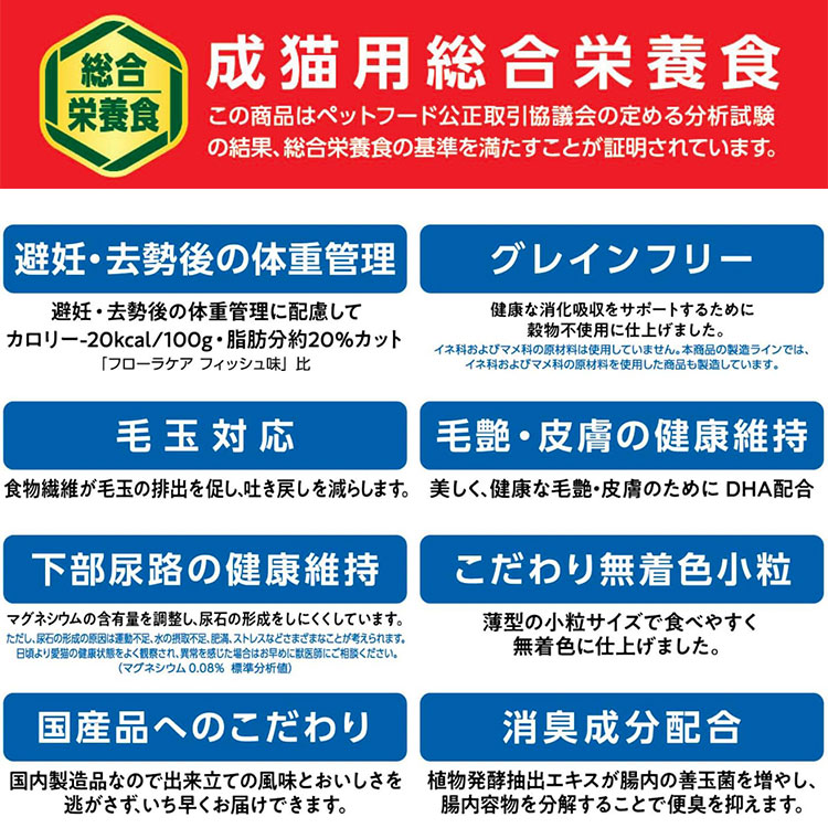 オリゴ糖・食物繊維が善玉菌をそだて、納豆菌・酪酸菌が善玉菌をふやすことで腸内の健康を維持 健康な消化吸収をサポートするためにグレインフリー(穀物不使用)に仕上げました避妊・去勢後の太りやすい体質をサポートするために脂肪分約20%カット下部尿路の健康維持に低マグネシウム設計、毛玉に配慮して食物繊維、美しく健康な毛艶・皮膚のためにフィッシュオイル(DHA)、ニオイに配慮して植物発酵抽出エキスを配合●対象:成猫用(1歳から)/全猫種用/避妊猫用・去勢猫用●内容量:720g(120g×6)×12個●エネルギー:350kcal/100g●原産地:日本●メーカー:スマック●JANコード:4970022024574●キーワード成猫用 高齢猫用 シニア猫用 老猫用 全猫種用 成猫用総合栄養食 乳酸菌配合 無着色 超小粒 F.L.U.T.に配慮 毛玉対応 消臭成分配合 またたびの応募券付き 国産品 小分けパック 正規品 無着色 毛玉ケア ヘアボールケア 下部尿路の健康維持用 FLUTの健康ケア トッピング 腸内の健康維持 避妊猫用 去勢猫用 猫フード 猫用フード 猫ごはん えさ エサ 餌 カリカリ フィッシュエキス サカナ 魚 イネ科不使用 マメ科不使用 脂肪分カット ダイエット 体重管理フローラケアCAT 避妊・去勢猫用フィッシュ味 720g
