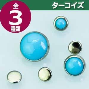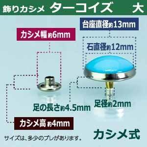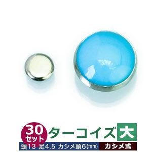 ターコイズ【大】【サイズ頭13mm 足長4.5mmカシメ6mm】【材質:真鍮・石ベース】30セット1袋美しいターコイズ・ブルー色のチャームがはめ込まれた飾りカシメです。 「Turquoise(ターコイズ)」は、トルコ石と呼ばれることも多い宝石ですが、それを模した飾りをカシメ足にあしらいました。 落ち着きのある緑がかった青が、ナチュラルな革色に似合います。取り付け構造がカシメ方式になっていますので、カシメと同じような要領で打つことができます。 財布や革製のキーホルダー、携帯ストラップなどのアクセントとなります。専用の工具(手打ち棒かハンドプレス)で上からしっかりと叩いてください。頭の形:半球形状品 名:ターコイズ【大】サイズ:頭13mm 足長4.5mmカシメ6mm材 質:台・真鍮メッキ:ニッケル詳 細:30セット入り1袋"} 頭の形:半球形状