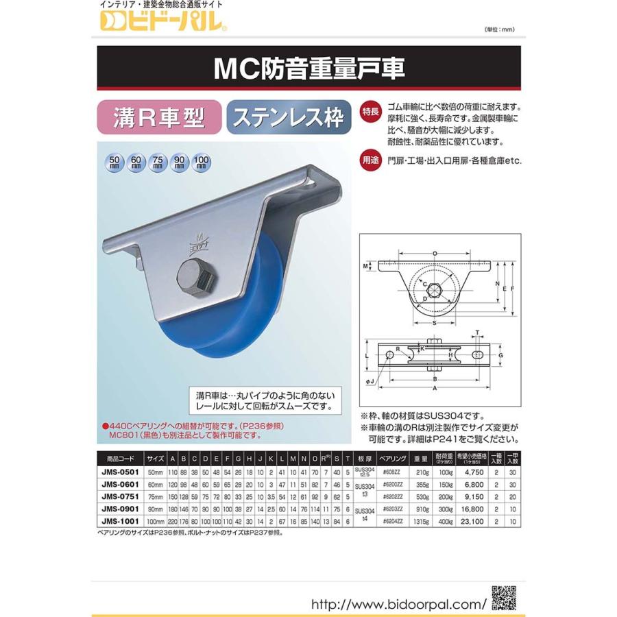 【※ご注文の際には必ず「全ての画像」「説明テキスト」「商品名(特にサイズ)」の確認をお願い致します。】戸車メーカーとして高い実績を誇るヨコヅナの重量車です。【用途】門扉・工場・出入口用扉・各種倉庫など。【製品特長】・MCナイロンは、ゴム車輪に比べ、数倍の荷重に耐え、摩耗に強く、長寿命。金属製車輪に比べ、騒音が大幅に減少します。耐蝕性、耐薬品性にも優れています。・溝R車は、丸パイプのように角のないレールに対して回転がスムーズです。【同シリーズ展開一覧(メーカー品番)】JMS-0501、JMS-0601、JMS-0751、JMS-0901、JMS-1001※各サイズの耐荷重は画像内の表にてご確認ください。※耐荷重は戸車2個当たりの垂直方向における参考耐荷重です。※車のみの販売も行っています(関連商品参照)。"}