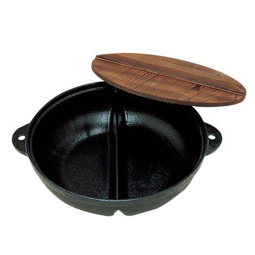 三和精機 (S)鉄 ホンコンしゃぶ鍋 QSY61 JANコード 4560378692406●外径(mm):298●内径×高さ(mm):280×80●深さ(mm):65●容量(L):1.2×2●重量(kg):4.1●底径(mm):180●材質:鉄鋳物 天然木■鍋は、積み重ねができます。■※電磁調理器対応100V・200V対応。