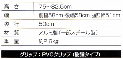 【送料について】北海道、沖縄、離島は別途送料を頂きます。キャスターの大きなBタイプもあります。高さ 75〜82.5cm幅 前幅 58cm 後幅 58cm 握り幅 51cm奥行 50cm材質 アルミ製 一部スチール製重量 約2.6kg歩行器一覧へ"}