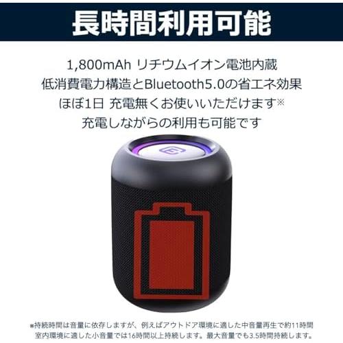 Bluetooth5.0 ブルートゥーススピーカー : Bluetooth5.0に対応。ブルートゥースのバージョン5には、通信範囲、データ転送量、遅延なし転送、省エネ性能等、従来のバージョンに比べて数々の大きな技術的進歩が含まれています。下位互換性がありますので、iPhoneやAndroidスマートフォン、MacやPC、タブレットをはじめ、Bluetoothの出力に対応したテレビ用や家電製品との接続用としてもご利用可能です。"}