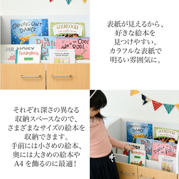 | カウンター下に収納できる絵本ラック。 絵本棚は表紙が見えるので読みたい絵本がすぐに見つかります。 扉内の大きな収納スペースは、おもちゃやお道具箱などの収納に便利。 | |