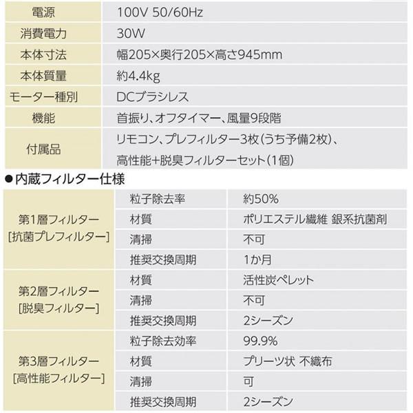 ■電源:100V 50/60Hz■消費電力:30W■本体寸法:205×205×945mm■本体質量:約4.4kg■風量切替:9段階■搭載機能:首振り、オフタイマーなど■付属品リモコン,プレフィルター3枚(予備2枚),高性能+脱臭フィルターセット1個■フィルター交換目安プレフィルター:約1ケ月高性能+脱臭フィルター:約2年※記載は商品仕様の一部です。仕様説明不足等の理由での返品はできません。特に適合等は必ずご確認ください。■ Chrester ■