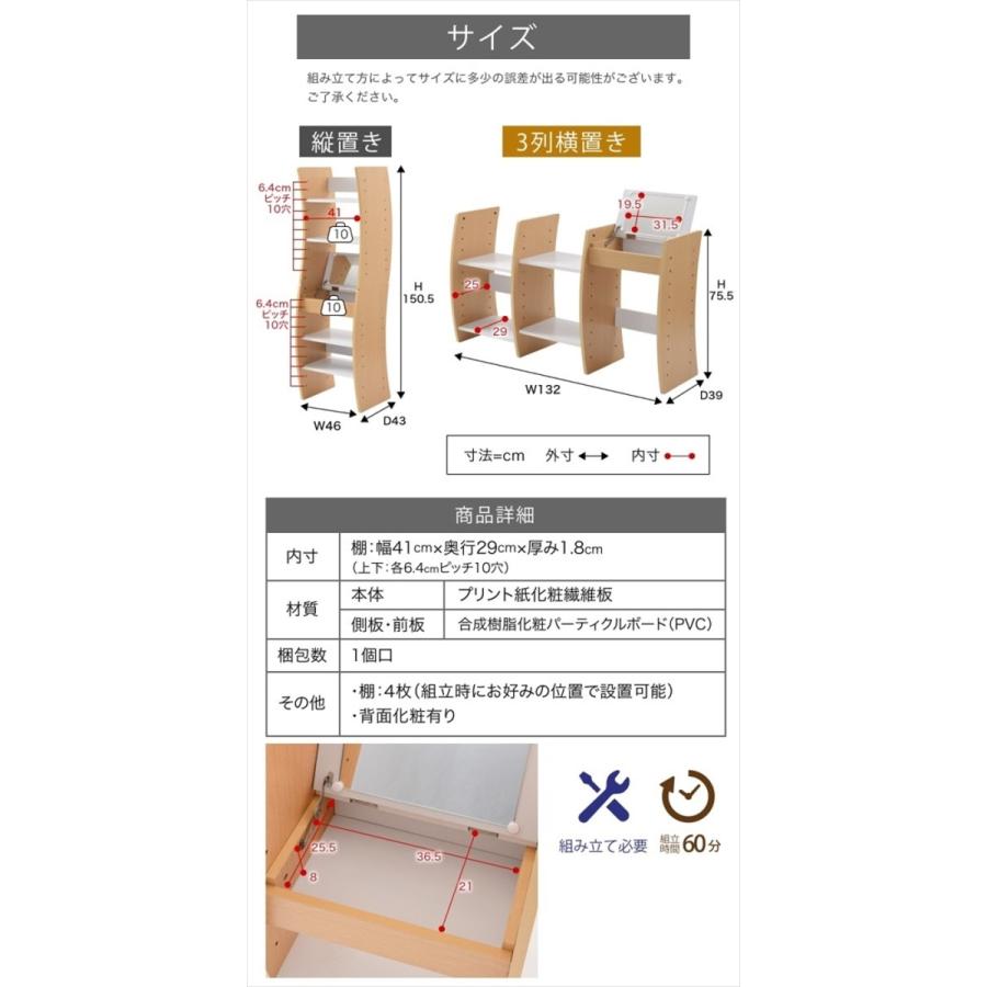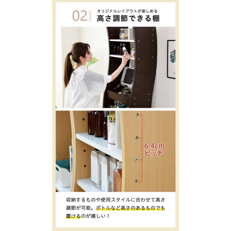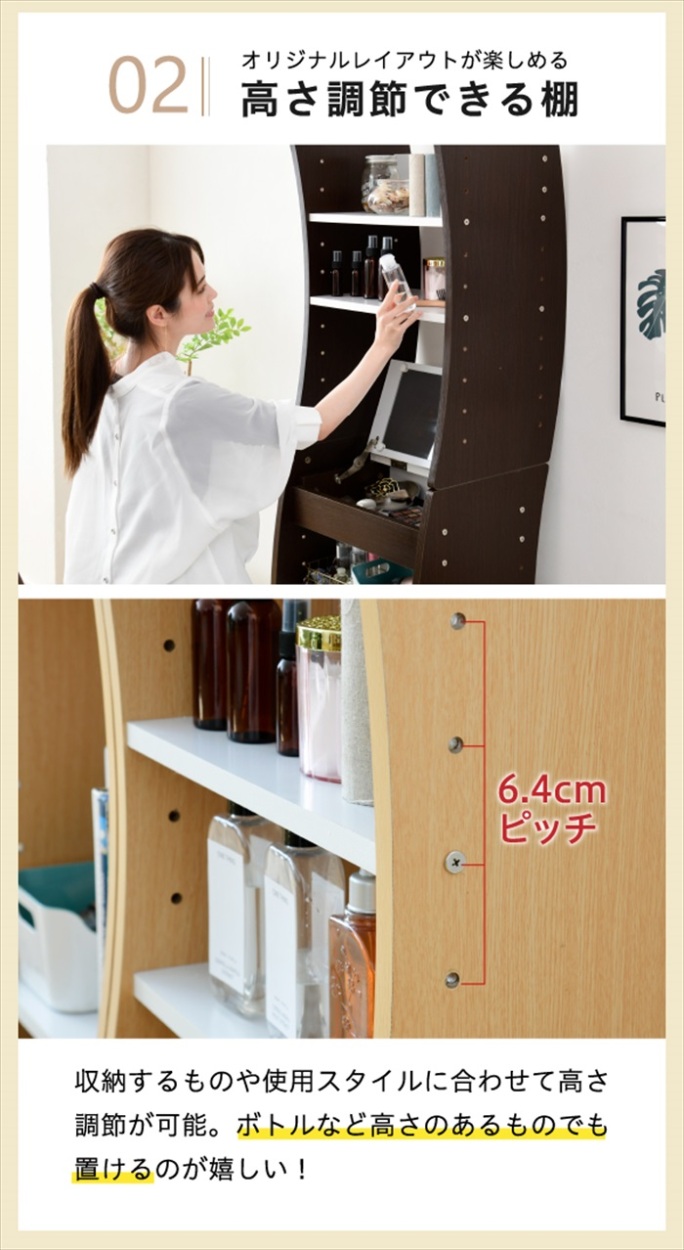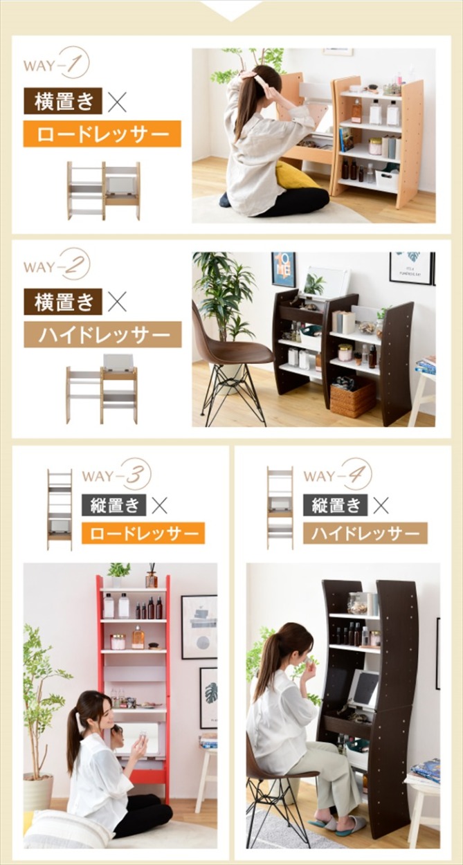 好みに合わせて、イス仕様のハイタイプ、座仕様のロータイプに設定可能。天板も含めて全ての棚が可動式だから、さらに細かく微調整可能。また、縦に積み重ねても、横に並べてもOKなので、お部屋の空間や好みに合わせて自由にレイアウトできます。可動式の棚だから、収納物に合わせて調整できるので、散らかりがちなメイク道具もこの商品一つですっきり収納できます。自由な機能と、特徴的なウェービーな側板デザインが上手く融合し、機能性とデザイン性を高次元で両立しました。▼ 本体サイズ[外寸](縦置き)約幅46×奥行43×高さ150.5cm▼ その他サイズ[内寸](可動棚)約幅41×奥行29×厚み1.8cm(上下:6.4cmピッチ各10穴)(ミラー)約幅31.5×奥行19.5cm(ミラー下)約幅36.5×奥行21(有効25.5)×高さ8cm▼ 材質[本体]プリント紙化粧繊維板[側板・前板]合成樹脂化粧パーティクルボード(PVC)▼ 耐荷重[ドレッサー]約10kg以下[棚板]各約10kg以下▼ 備考 ・棚:4枚(組立時にお好みの位置で設置可能) ・背面化粧あり▼ 生産国中国▼ 組立時間(目安)(大人2人)お客様組立(60分)