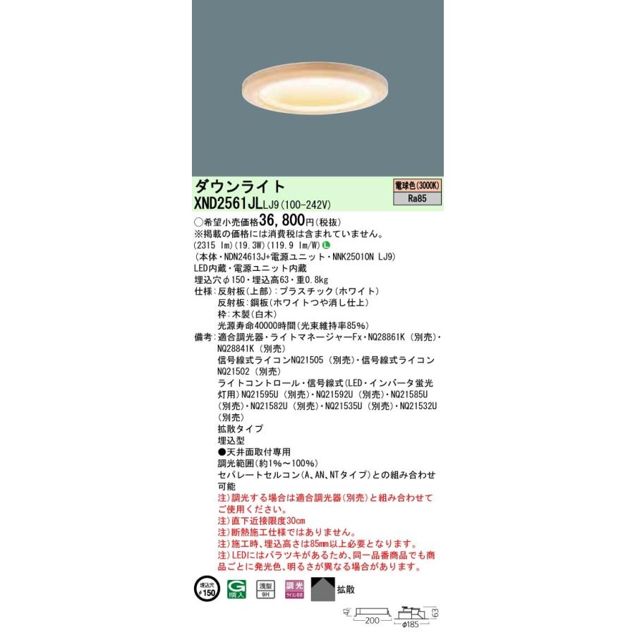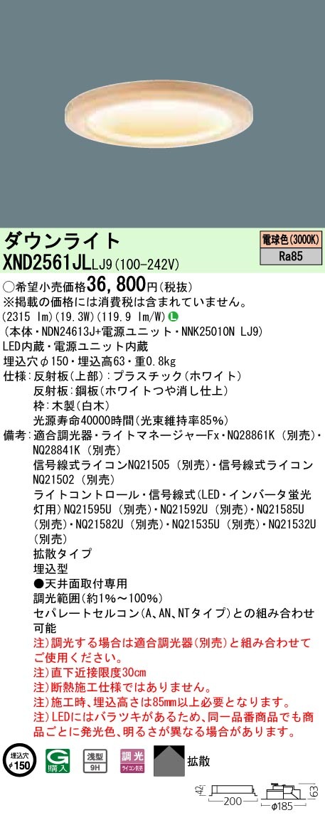 XND2561JL LJ9LED内蔵、電源ユニット内蔵【本体】NDN24613J【電源ユニット】NNK25010N LJ9光源◆LED(電球色) ◆色温度:3000 K ◆光源寿命40000時間(光束維持率85%)寸法・質量◆埋込穴径:φ150 mm ◆埋込高:63 mm◆質量:0.8 kg仕様◆器具光束:2315 lm ◆電圧:100〜242 V ◆消費電力:19.3 W ◆消費効率:119.9 lm/W◆【反射板(上部)】プラスチック(ホワイト)◆【反射板】鋼板(ホワイトつや消し仕上)◆【枠】木製(白木)◆天井埋込型、埋込穴φ150、浅型9H・拡散タイプ◆Ra85【適合調光器】ライトマネージャーFxNQ28861K (別売)【適合調光器】ライトマネージャーFxNQ28841K (別売)◆拡散タイプ◆埋込型◆●天井面取付専用◆調光範囲(約1%〜100%)◆セパレートセルコン(A、AN、NTタイプ)との組み合わせ可能◆調光する場合は適合調光器(別売)と組み合わせてご使用ください。◆直下近接限度30cm◆断熱施工仕様ではありません。◆施工時、埋込高さは85mm以上必要となります。