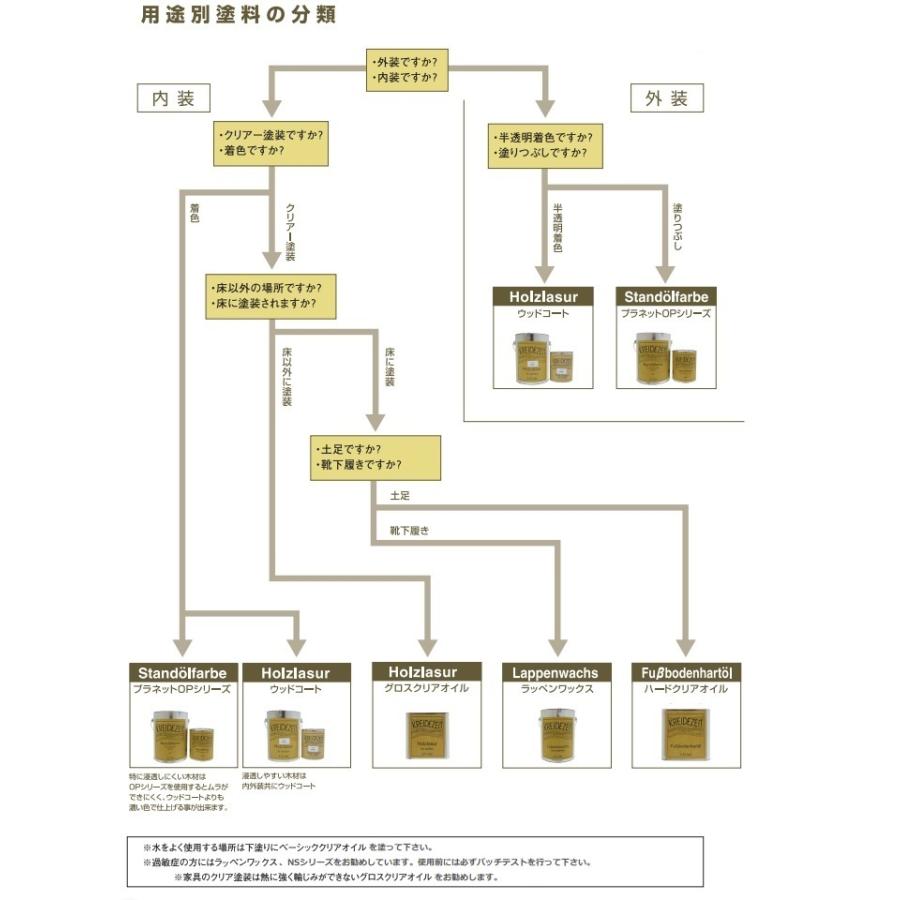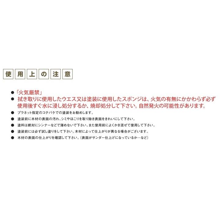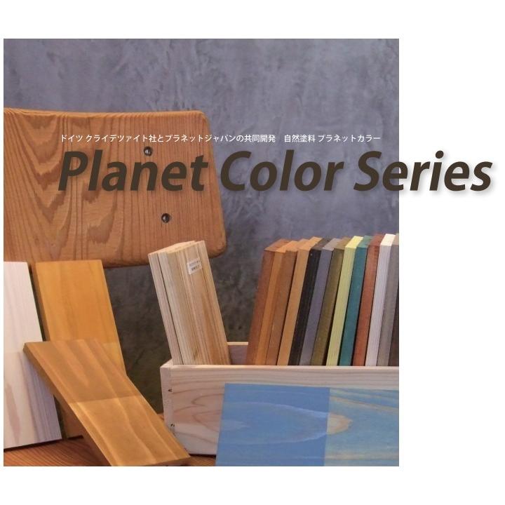 メーカー:プラネットジャパン社(クライデツァイト社・プラネットジャパン共同開発)用途:内装用仕上がり:クリア (つや消しタイプ)塗装回数:1回塗装面積:15〜20平米/L容量(塗装面積):0.75L(12平米)、2.5L(41平米)、10L(166平米)成分:亜麻仁油、桐スタンドオイル、亜麻仁油スタンドオイル、天然樹脂、バルサムテレピン油、グリセリンエスター、無鉛乾燥剤施工方法:塗装後、すぐ拭き取り。(拭き取りの際は、塗装面のベタツキが残らないようにしっかり拭き取りをしてください。)"} ■Planet Color Series プラネットカラー■