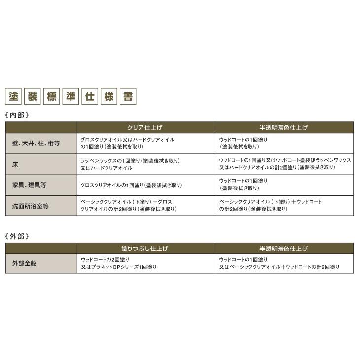 天然樹脂の働きで表面を堅く保護するので、壁や天井だけでなく土足の床にも適しています。グロスクリアオイルに比べるとつや消しタイプになります。