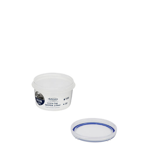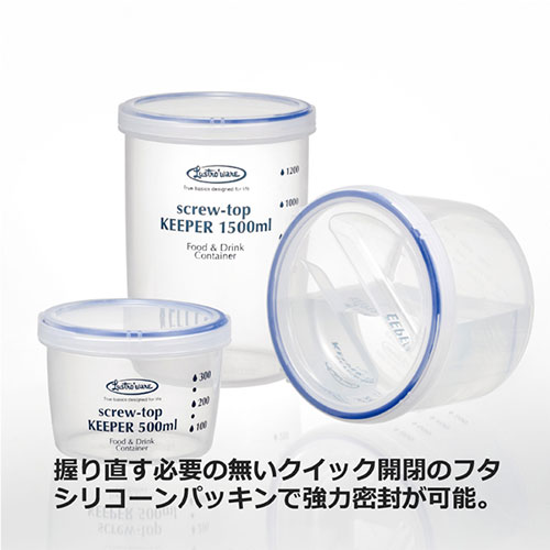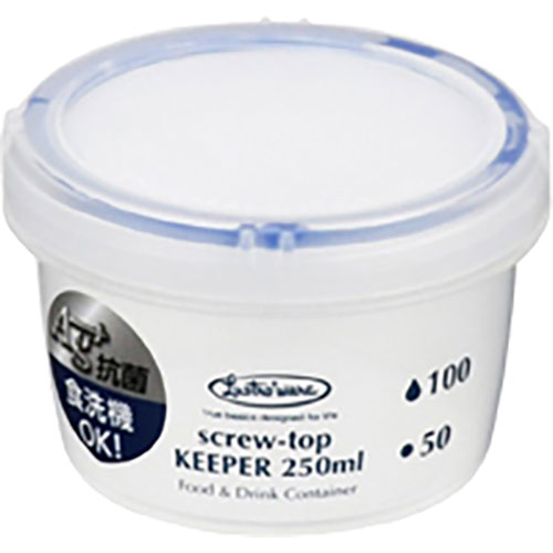 | 抗菌スクリュートップキーパー250浅型 〇筒型のポリプロピレン製シリコーンパッキン付ネジ式密封容器です。 〇めやすとなる目盛印刷付き。 〇1/6回転(60度)でクイック開閉できる構造。 〇同形状は3サイズ入れ子になる省スペース設計、同じ直径なら浅型は2段積みで深型の高さとなるモジュール化で、冷蔵庫の中もスッキリ収納できます。 〇フタを外せば本体は電子レンジに使用可能、食器洗い乾燥機にも使えて溶けださない安全な銀イオン系抗菌剤が練り込まれている清潔仕様。 〇液体やニオイの強い食材の保存にぴったりです。 |