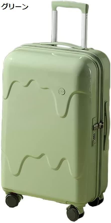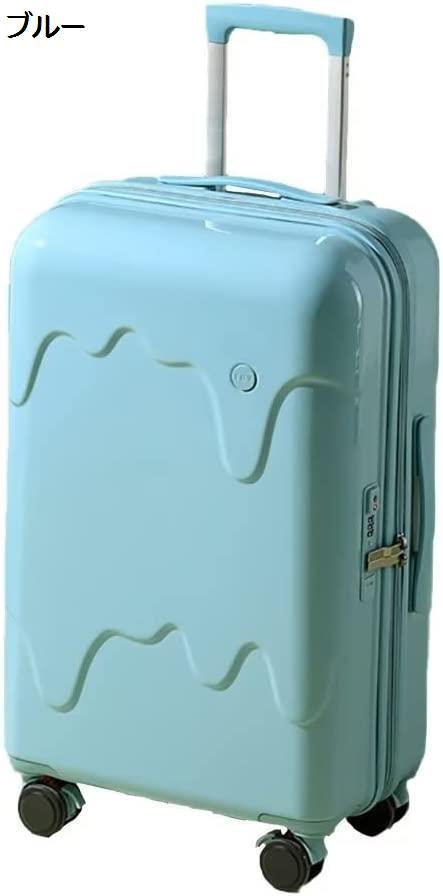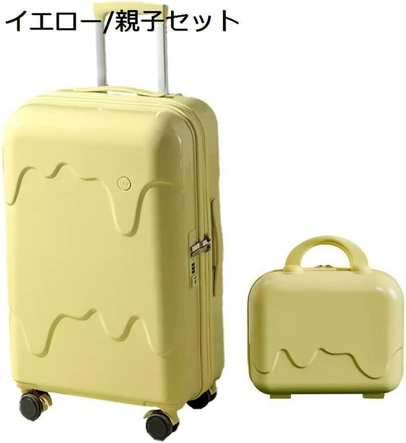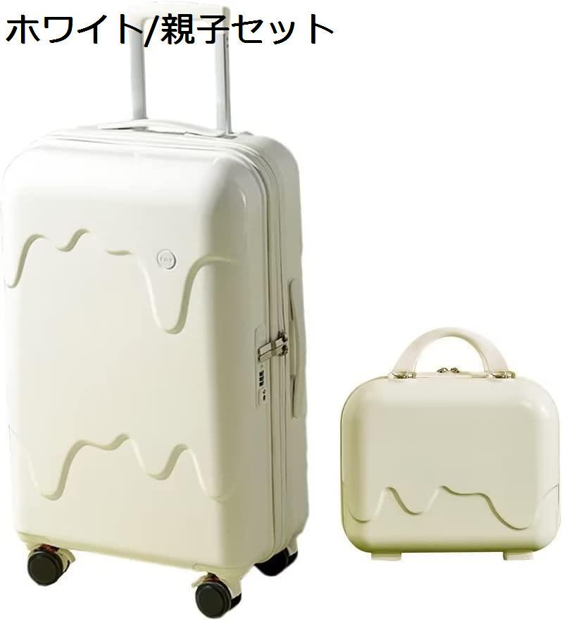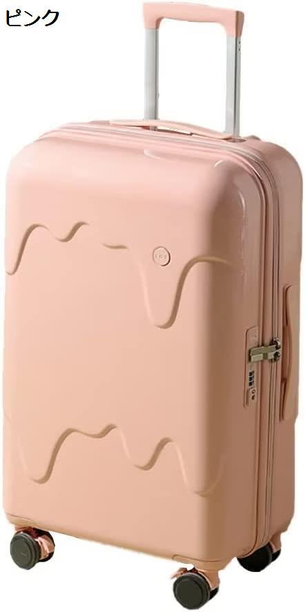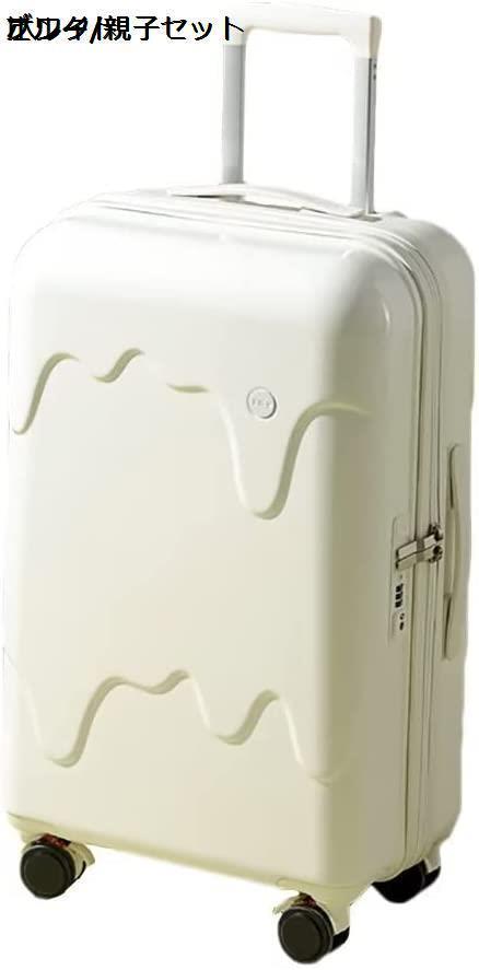 【かわいいアイスクリームのデザイン】独特のスーツケースデザインで、表面はアイスクリームが溶けているように見えて、とても可愛くて、乙女心と活力に満ちています。旅行、修学に適していて、とても注目を集めています。同じデザインのミニボックスが付属し、2倍かわいく、2倍楽しく、旅行生活を楽しむことができます。【USB充電機能付き】スーツケースにはUSB充電ポートが設けられており、歩きながらスマホを充電することができます。(ご注意:モバイルバッテリーは含まれていません)【ABS+PC高品質ボディ】軽くて弾力性があり、割れにくいABS樹脂に耐衝撃性・耐熱性などに優れた。ポリカーボネート樹脂を配合することで、信頼性の高い高品質なボディを実現しました。【360°/静音キャスター】新たに採用されたWキャスターで安定走行が実現しました。海外に多い石畳やレンガ道でも滑らかに動かすことができます。8つの車輪に荷重が分散されるため耐久性にもすぐれています。"} 材質:ABS+PCSサイズ:34cm×22cm×54cm、容量:43L、目安:1泊〜3泊向き、機内持ち込み:可Mサイズ:38cm×23cm×59cm、容量:52L、目安:5泊〜7泊向き、機内持ち込み:Lサイズ:42cm×25cm×63cm、容量:66L、目安:7泊以上向き、機内持ち込み:XLサイズ:44cm×26cm×68cm、容量:86L、目安:7泊以上向き、機内持ち込み:XXLサイズ:47cm×28cm×73cm、容量:92L、目安:15泊以上向き、機内持ち込み:シリコン製ハンドル搭載:柔らかく手に馴染むシリコン素材のため、長時間の移動も可能です。多段式伸縮ハンドル搭載:ボタンワンプッシュで高さの調整可能なので、お好みの高さでご使用いただけます。静音キャスター:TPE衝撃軽減素材のキャスターを採用し、より静かで耐摩耗性も向上しています。長時間の使用でもスムーズにコロコロ動きます。360度の自由回転もでき、どこまでも自由に行きます。傷つきにくい:軽くて丈夫なPC(ポリカーボネート)とABS樹脂を採用!割れにくく頑丈なボディーで大切なお荷物を守ります。シンプルなデザイン:マカロンカラーで、色がカラフルです。男の子でも女の子でも、学生でもサラリーマンでも、あらゆる人に適しています。収納能力拔群:収納能力が非常に高く、初心者の方から旅慣れた方まで幅広くご利用頂けるスーツケースです。注意:測定方法によっては1~3cmの誤差がある場合がありますのでご了承ください。画像と実物のカラーにつきましては、撮影時の光加減やお客様のブラウザによって、実際のイメージと若干異なる場合もございます。思っていたサイズが違うなどのケースが発生しておりますので、必ずサイズ表をご確認の上ご注文の程よろしくお願い致しま。