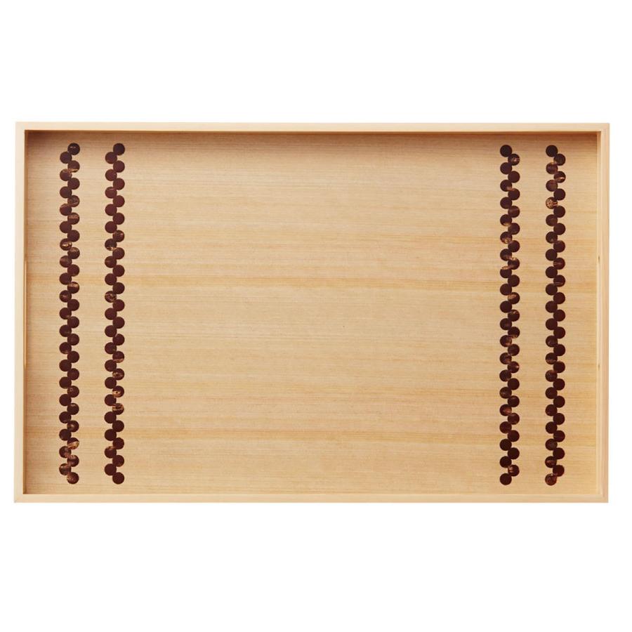 樺細工 冨岡商店の「木製トレイ Tsunagu 丸柄 L」です。冨岡商店とYOnoBIがデザインしました。ヒノキ製の板の表面に、丸柄がつながった桜皮の飾りをあしらっています。ヒノキと桜皮(山桜の樹皮)の濃淡が美しいコントラストを見せ、木のぬくもりが感じられる仕上がりです。3〜4人分の食器が運べる大ぶりなLサイズです。サイドには持ちやすいように穴があいており、またコーティングしているので丸洗いすることができます。「Tsunagu」シリーズのシンプルかつモダンなトレイです。※商品の性質上、色彩・柄・形状等が多少異なる場合がございます。