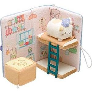 大人気!すみっコぐらしのぬいぐるみ絵本です。広げるとフルカラー印刷のすみっコの寝室になっています。てのりぬいぐるみのねこ付です。二段ベッドとタオルケットが付いています。2段ベッドのはしごも付いて可愛いです。すみっコのおもちゃ箱には小物をしまって遊べます。
