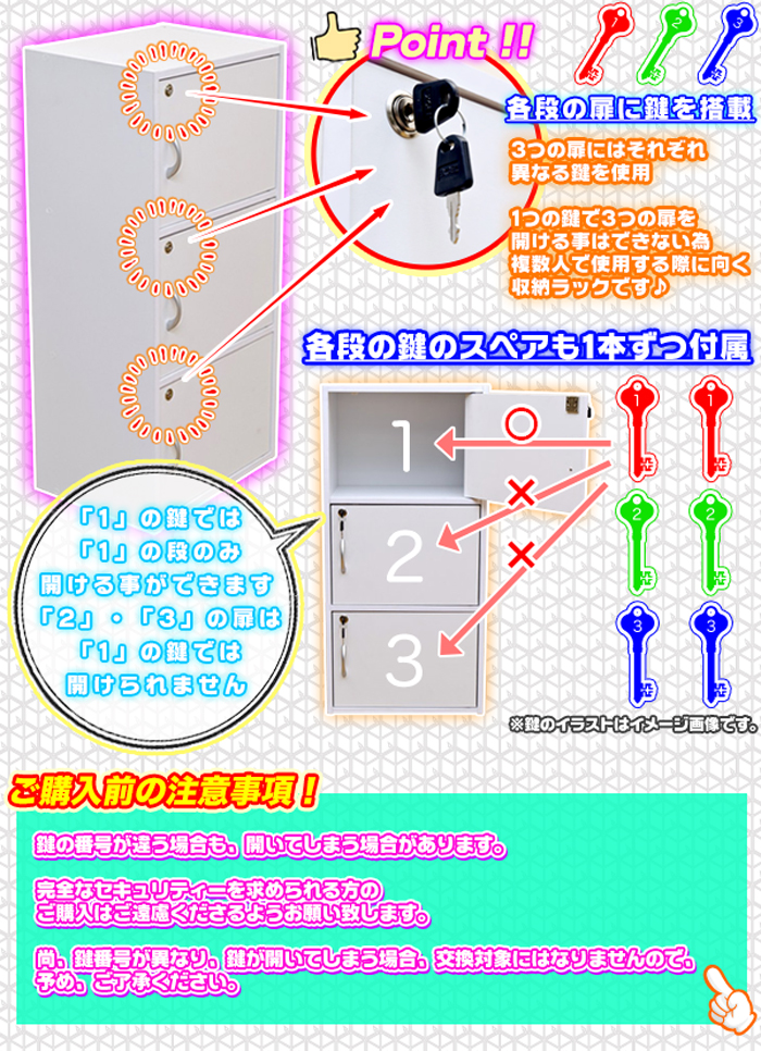 | 鍵付の収納ボックス。スペアキーも付属しています☆彡 各段異なる鍵を採用、貴重品の収納にも最適な収納ラック! |