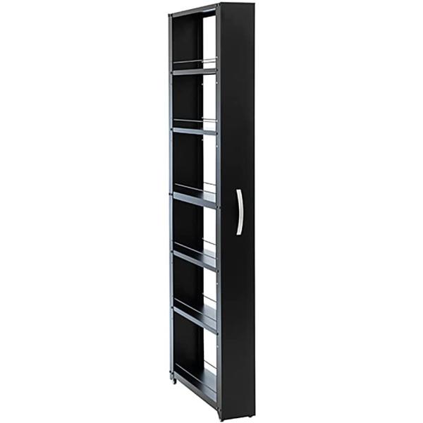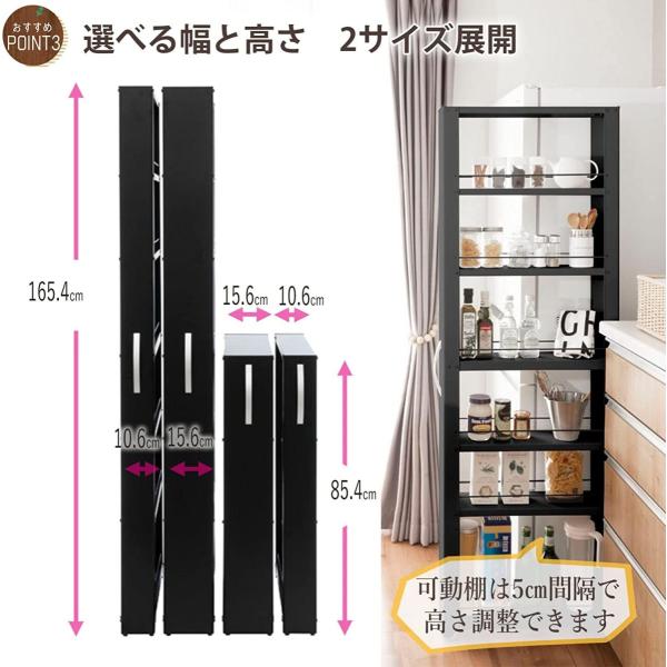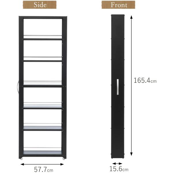 ★すき間に収まると正面から物が見えず、スッキリきれいな印象になります。また、左右どちらにでも設置が可能なので、両サイドはオープンで見やすくなっていて出し入れもスムーズに行えます。※必ず、すき間に入れてご使用ください。※組み立てやお手入れの際は、製品の切り口などで手を切るおそれがありますので必ず手袋をしてください。※制限荷重をお守りください。※平らな堅い面でご使用ください。木質系のフロア、クッションフロア、畳などでご使用の場合、キャスターにより床に傷をつける場合があります。※組み立て終了後は、各部のネジが完全に締まっているか確認してください。また、チェーンを必ずつけてください。色:ブラックサイズ:幅15.64×奥行57.7×高さ165.2cm材質:本体/スチール、粉体塗装処理原産国:中国※耐荷重棚板1枚: 8kg※耐荷重全体: 50kg※組立:要工具(プラスドライバー)★こちらの商品はメーカーより直送にてお届けになります。★北海道、沖縄、離島は別途送料がかかります。